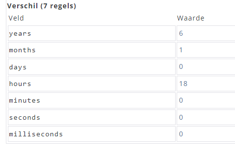 Let op: In een tijdsduratie tellen dus niet het verschil op. Wil je dit wel? Gebruik dan “Tijdsduur omzetten” of kies opties zoals dagen / minuten / seconden.