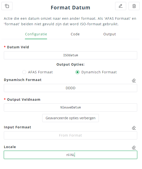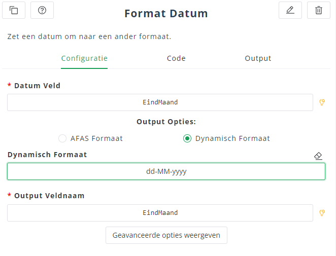- Input formaat (geavanceerd): Is jouw Input anders dan dd-MM-yyyy ? geef dan het input formaat op.
