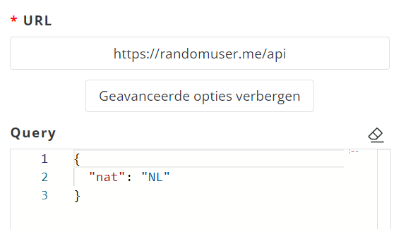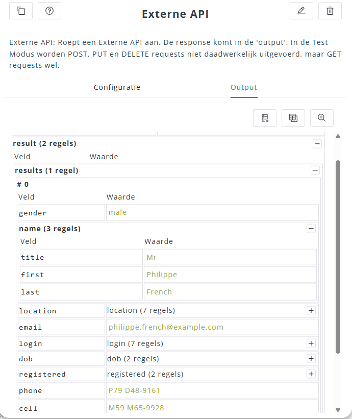 De “Externe API” wordt gebruikt om een andere API (Webservice) aan te roepen. Je kunt dit bijvoorbeeld gebruiken voor het ophalen van een “wisselkoers” of het genereren van een willekeurige naam.