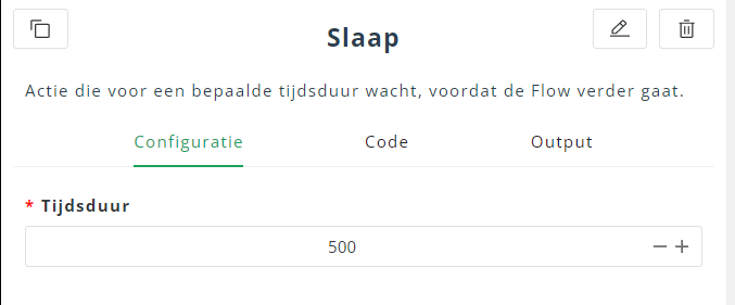 Met deze actie kun je de flow even laten wachten voordat hij verder gaat. Dit is soms nodig bij bijvoorbeeld het updaten van een vrij bestand met autonummering. Flow kan dan sneller gaan dan dat AFAS aankan. Een slaap actie van 500 milliseconde (0.5 seconde) tussen iedere update is dan nodig om te voorkomen dat AFAS dubbele nummers uitgeeft.
